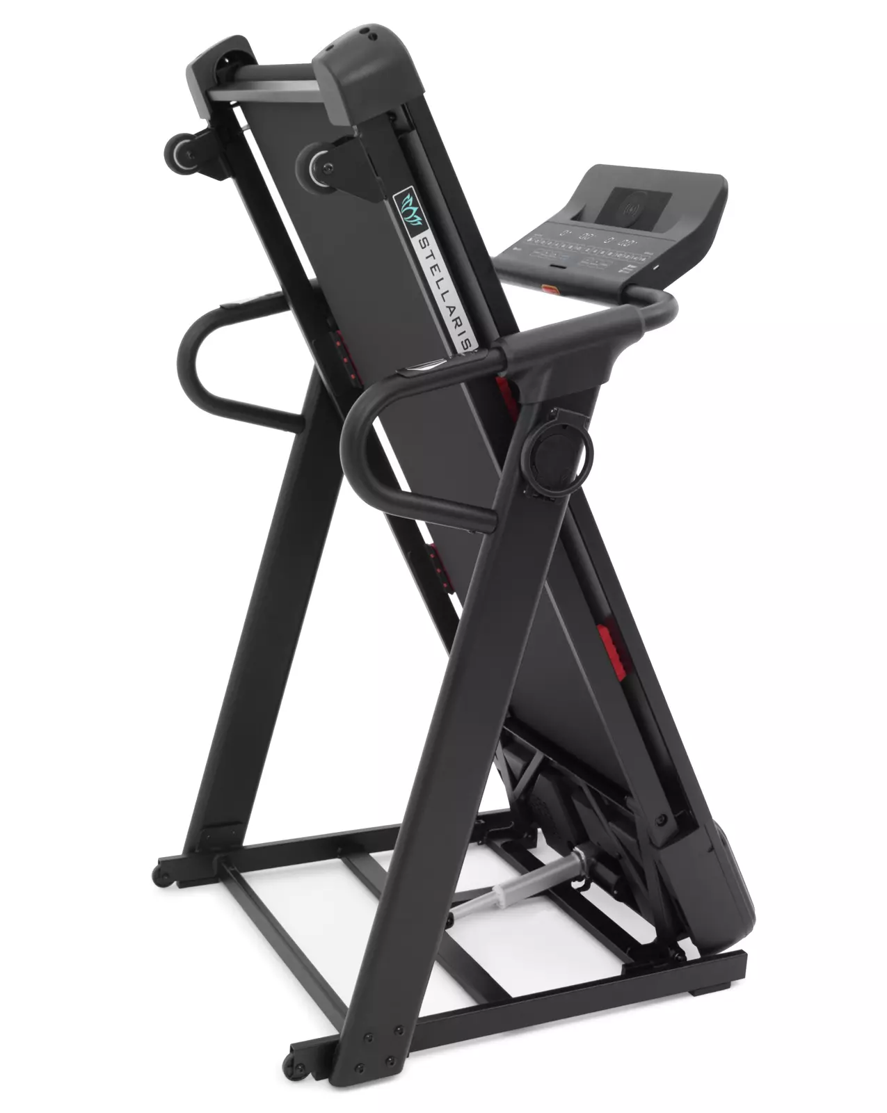Уникальной и по-настоящему премиальной функцией Aura Labs™ Stellaris является технология автоматического складывания и раскладывания easy-Lift™. Все классические беговые дорожки достаточно легко раскладываются за счет газового доводчика. Но что насчет складывания? Дека беговой дорожки среднего уровня весит от 20 до 40 кг, для тяжелых дорожек до 60 кг и выше. И если для мужчины складывание дорожки обычно не представляет особой проблемы, то для женщин и людей пожилого возраста это сложно, а иногда и просто невозможно физически. Поэтому инженеры Dynamatica создали уникальную, присутствующую только в продуктах Aura Labs™, технологию автоматического складывания и раскладывания easy-Lift™. Теперь не надо руками раскладывать и, самое главное, складывать обратно беговую дорожку. Это можно сделать с помощью одного нажатия кнопки – в прямом смысле этого слова. Одно нажатие на раскладывание, одно на складывание. Технология также максимального продумана с точки зрения безопасности – в дорожку встроены датчики присутствия. Если при складывании или раскладывании рядом с тренажером окажется человек или животное, движение деки остановится и тренажер предупредит об опасности характерным звуковым сигналом. Автоматическое складывание оправдано еще и в том смысле, что дорожка хорошо продумана в плане компактности и занимает в сложенном виде менее 1-ого квадратного метра (98*83 см).