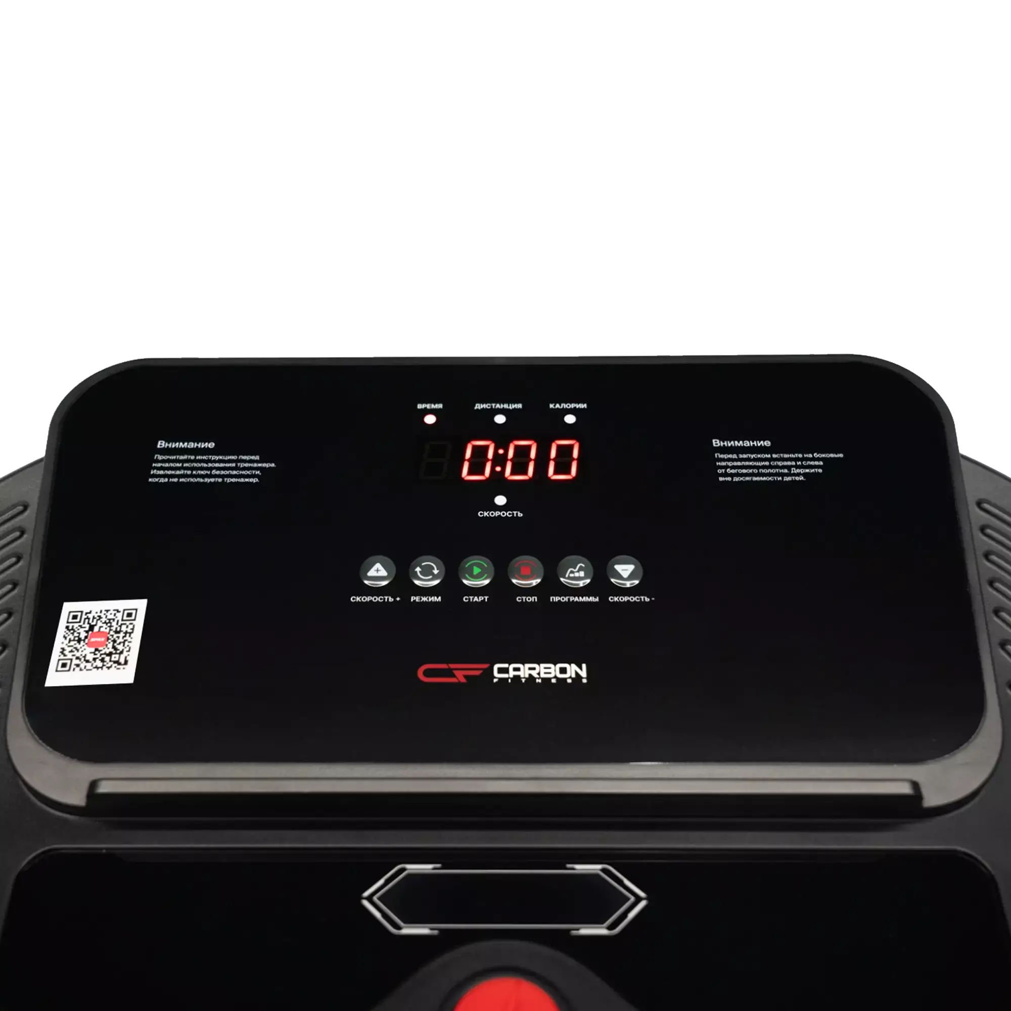 Консоль дорожки оснащена тремя LED-дисплеями с красной индикацией, отображающими ключевые параметры тренировки: время, скорость, дистанцию, калории, жироанализатор.