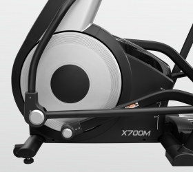 BRONZE GYM X700M – это полупрофессиональный эллиптический тренажер, способный выдерживать максимальные нагрузки пользователей в режиме нон-стоп. В основе надежной конструкции - высокопрочная рама с двухслойной покраской. Все изделия массивные и тяжелые, что говорит о фундаментальности бренда. Вес оборудования составляет 96 кг и способен выдерживать пользователей весом до 160 кг. X700M обладает рядом преимуществ в биомеханических свойствах. Среди них электромагнитная приводная система высшего класса (EMS) и сбалансированный маховик с инерционным весом 23 кг. Расположенный спереди маховик позволяет значительно лучше настроить общую траекторию движения, уменьшить расстояние между педалями и проще добиться увеличения длины шага. У BRONZE GYM X700M супермалый Q-Фактор, всего 6,2 см, длина шага равна 50,8 см. Мягкое педалирование и равномерное распределение нагрузки на всем цикле движения осуществляется за счет супернадежного дискового шатуна в педальном узле с использованием качественных подшипников. За плавное и тихое скольжение отвечают сдвоенные полиуретановые ролики коммерческого класса, которые передвигаются по усиленным парным направляющим. Последние обеспечивают как устойчивость тренажера, так и его надежность. Важной особенностью эллиптического тренажера является возможность изменять угол наклона. Для эллиптических тренажеров это довольно редкая опция. Угол наклона изменяется автоматическим путем до 15%, что позволит разнообразить тренировочный процесс и добавить интенсивности. Тренировочный компьютер представлен дисплеем профессионального уровня. Многофункциональный LED-дисплей с точечной матрицей и белой подсветкой. На экран компьютера выводятся все основные данные – время, скорость, дистанция, уровень нагрузки, уровень наклона, расход калорий, пульс, темп, фитнес тест. В программный пакет входят 12 предустановленных программ, в которых используются различные виды тренировок. Помимо предустановленных программ, можно воспользоваться самостоятельно регулируемым ручным режимом, а также создать собственную программу в одном из 3-х пользовательских режимов. 4 пульсозависимые программы отвечают за тренировку тех пользователей, которым важно контролировать верхние пределы частоты сердечного ритма. К числу дополнительных преимуществ модели относится возможность воспроизведения и вывода на динамики аудио файлов посредством AUX IN входа (через MP3-плеер, смартфон или планшет) или Bluetooth. Мобильное устройство можно расположить на подставке консоли. Также приятной опцией является держатель для бутылочки с водой. |
