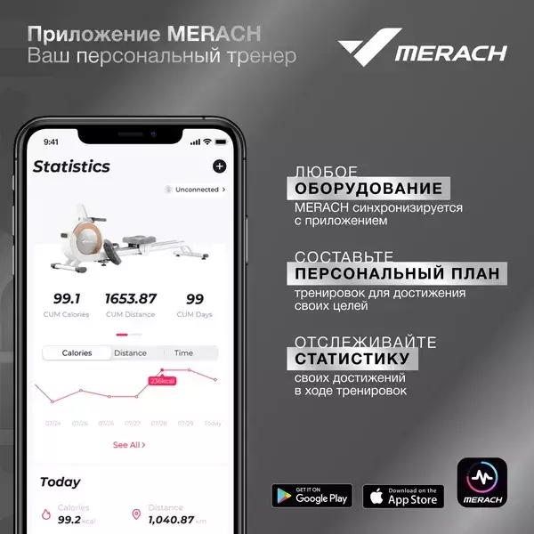 Модель Merach MR-636 оснащена встроенным дисплеем, на который выводится информация о пройденной дистанции, сожженных калориях и максимальной скорости. Транспортировочные колеса в основании корпуса отвечают за удобство при перемещении устройства. Поручни обладают противоскользящей поверхностью. Сиденье эргономичной формы исключает риск появления дискомфорта при длительных тренировках. Сопротивление при вращении педалей можно регулировать в зависимости от физической подготовки. На выбор предусмотрено 16 программ. Модель оснащена встроенным Bluetooth-адаптером.